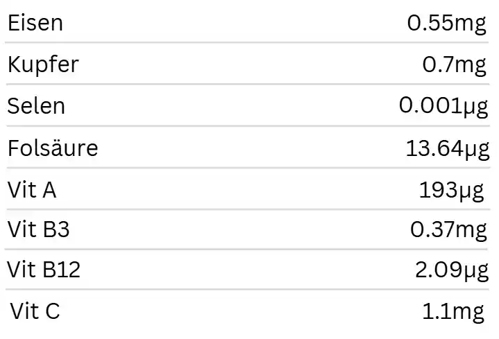 Diese Kombination liefert eine breite Palette an essentiellen Mikronährstoffen wie: Eisen, Kupfer, Selen, Vitamin A, Vitamin C, Vitamin B3 (Niacin), B9 (Folsäure), B12, Cholin für Gehirn und Leberfunktion