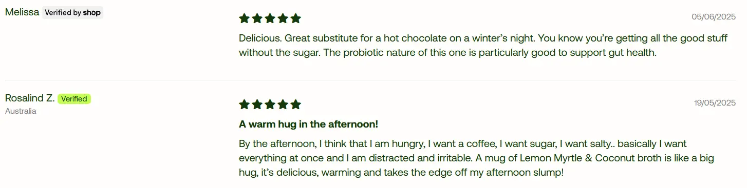 Trinke sie warm, indem du das Konzentrat mit heißem Wasser mischst – oder genieße sie kalt in Smoothies. Ersetze herkömmliche Brühe durch 1–2 Teelöffel pro Tasse in Suppen, Soßen, Aufläufen, Currys, Pasta oder Risotto.