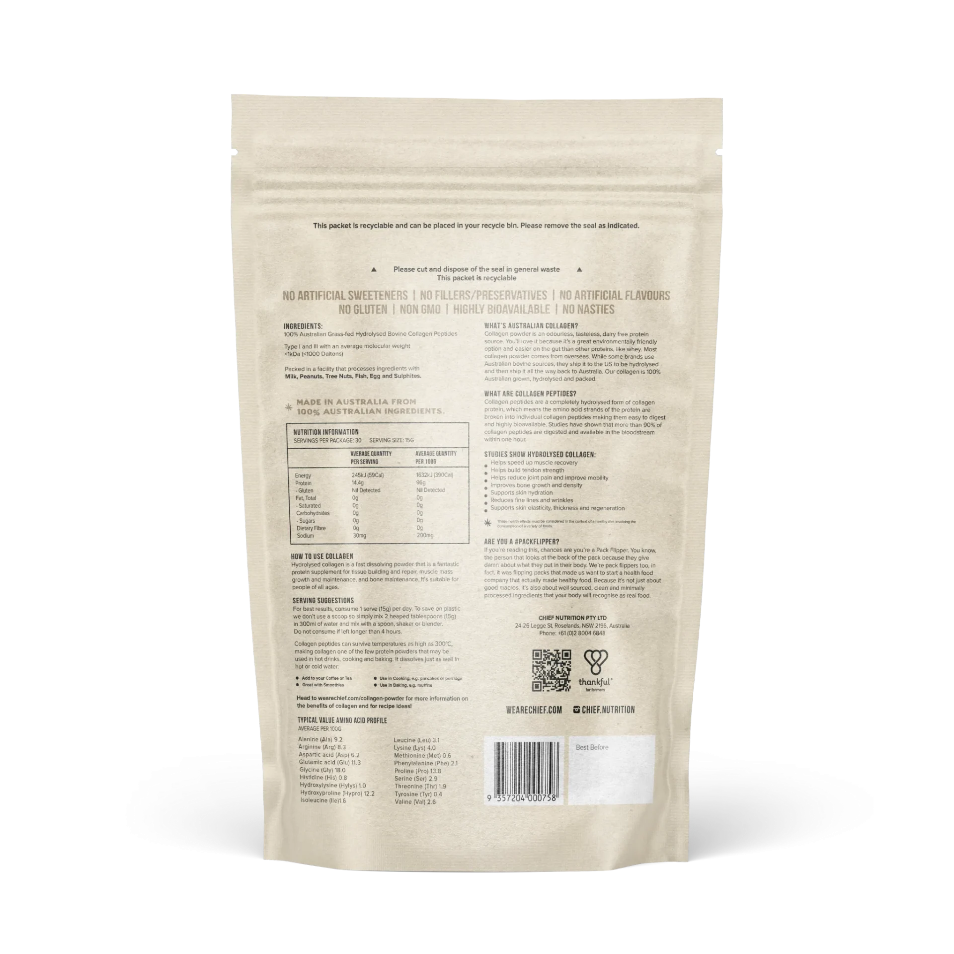Zutaten: 100 % australische, grasgefütterte, hydrolysierte Rinderkollagen-Peptide. Typ I und III mit einem durchschnittlichen Molekulargewicht von <1 kDa.