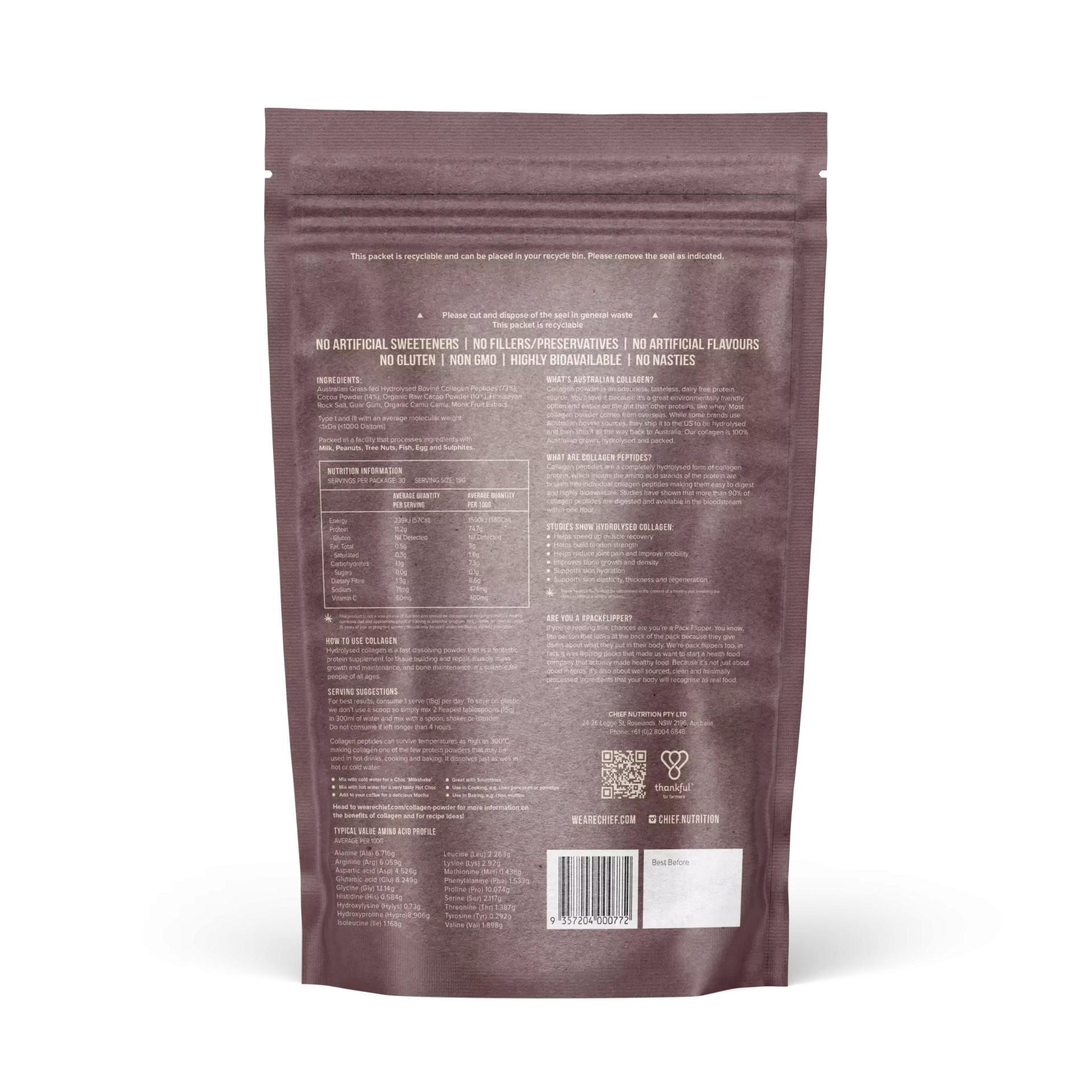 Zutaten: Australische, grasgefütterte, hydrolysierte Rinderkollagen-Peptide (73 %), Kakaopulver (14 %), Bio-Rohkakaopulver (10 %), Himalaya-Salz, Guarkernmehl, Bio-Camu-Camu, reiner Mönchsfrucht-Extrakt.