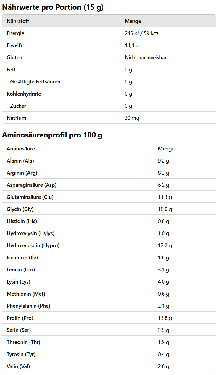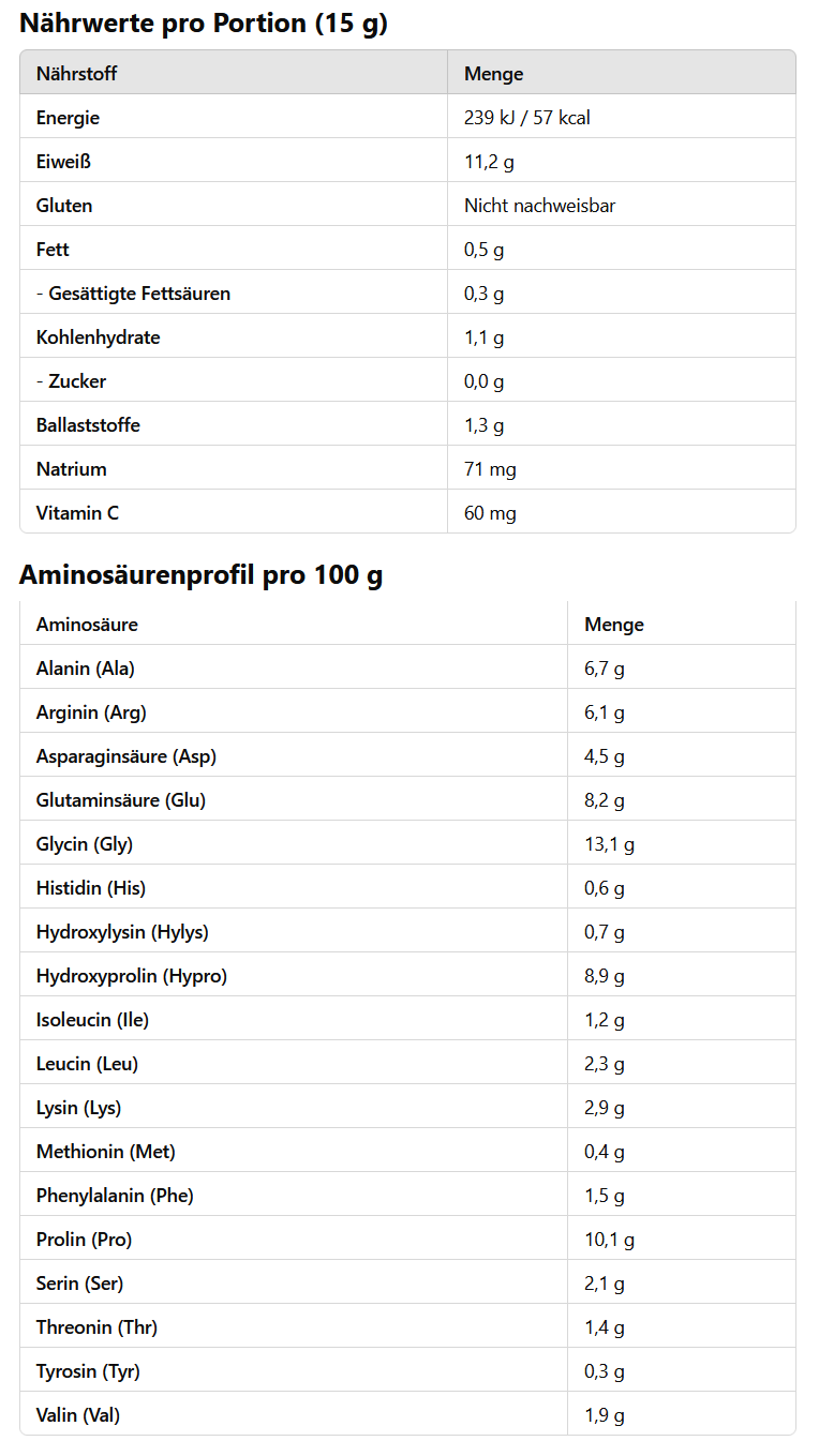 Eine Portion von 15 g enthält 15 g Kollagen (100 % Kollagen).